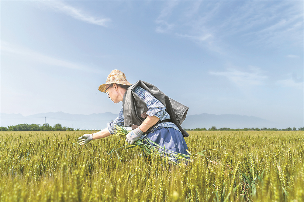 5月15日,永济市董村农场7000余亩麦田绿意盎然,丰收在望,农场职工对麦田进行除杂管护,以提高优良种子纯度,确保小麦增产增收。 特约摄影 刘立新 摄