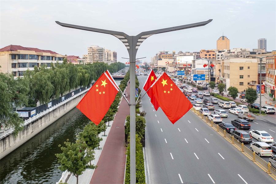 9月29日拍摄的中心城区禹都东街场景。 国庆节临近,中心城区主要街道挂起一面面国旗,营造出喜庆祥和的节日氛围。 记者 茹雅 摄
