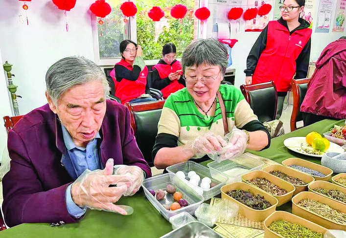 在香囊制作环节,居民将社区精心准备好的艾草等中药填充到香囊小袋里,不一会儿,一个个精巧别致、药香味扑鼻的香囊在居民的巧手中陆续诞生。