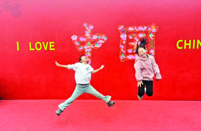 “快,帮我拍一张!”山西古城国家湿地公园新晋网红——“中国红”打卡墙前,欢声笑语不绝于耳。这面以“中国红”为主色调的墙体,左侧“I LOVE”字样鲜明夺目,中间匠心独运的“中国”艺术字融入传统花卉、建筑纹样,右侧搭配“CHINA”一词,与古朴的黑瓦相映成趣。小朋友在此定格天真笑脸,年轻人比心记录美好,每一张照片都满含真挚情感。