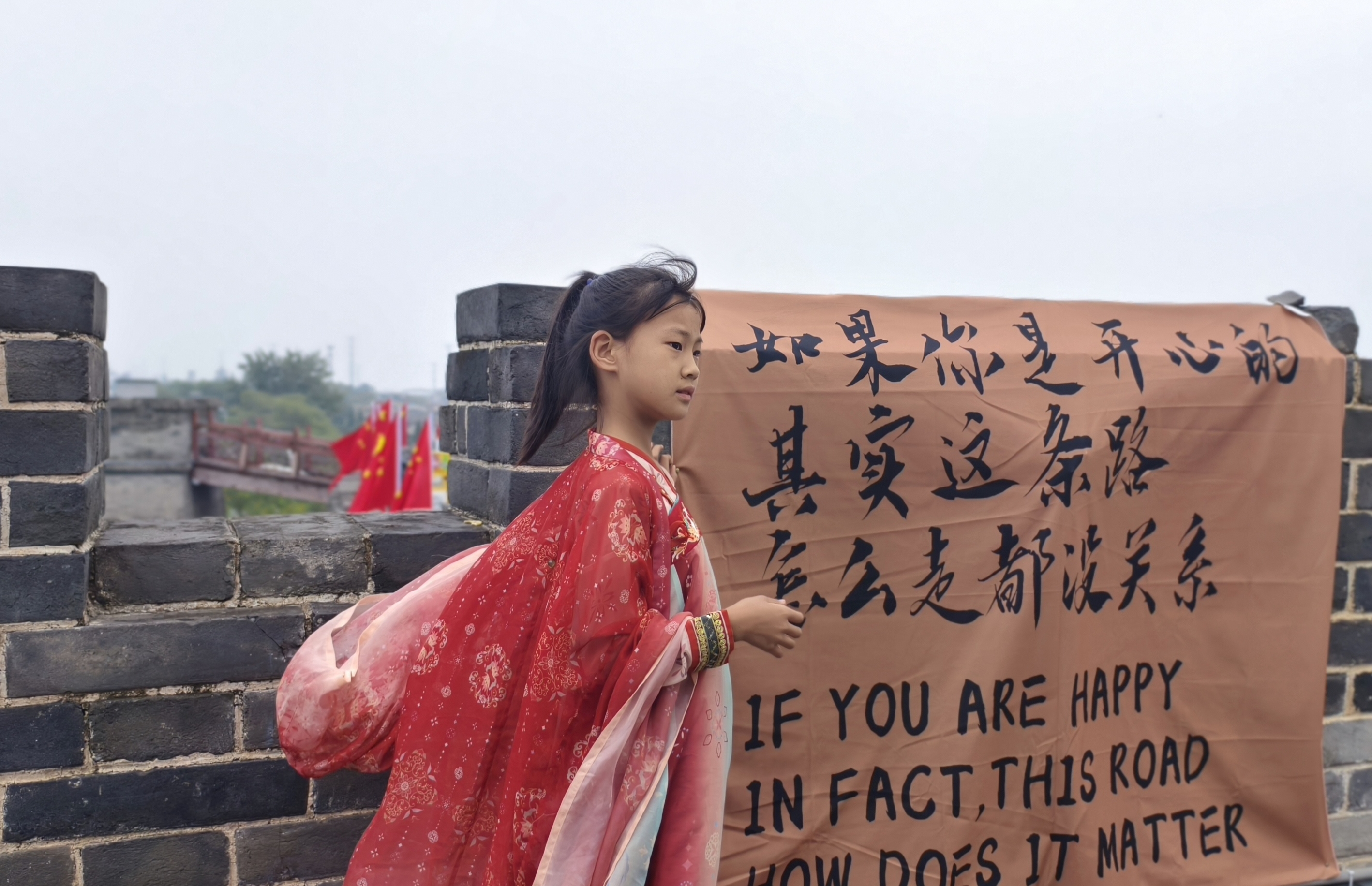 当10岁的雨欣穿着绯红齐胸襦裙站在河东池盐博物馆的城墙上,砖墙上“如果你是开心的,其实这条路怎么走都没关系”的标语布被风掀起一角,裙裾上的刺绣与城墙的青砖则让人看到了一幅跨越时空的美丽场景。