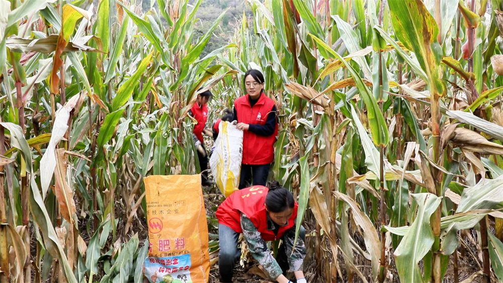 志愿者帮助农户采收玉米