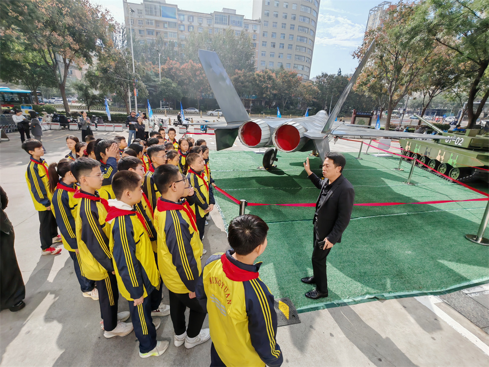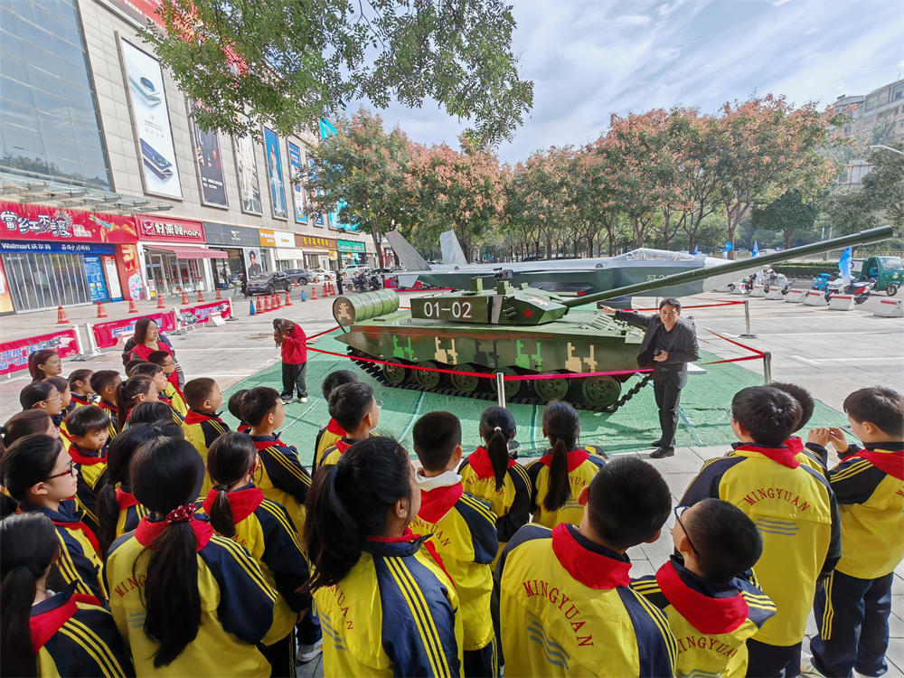 10月14日上午,在新象城南广场,运城市明远小学的40余名高年级学生正围在歼-20战斗机、99A式主战坦克1:1复刻模型旁,开启一场震撼的“大国重器”探索之旅。