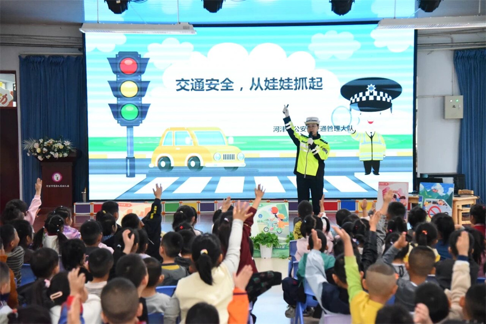 近日,河津公安交警宣传民辅警走进辖区机关幼儿园,开展了一场别开生面的交通安全宣传教育活动,积极推进“大排查、大整治、大宣传”百日行动。