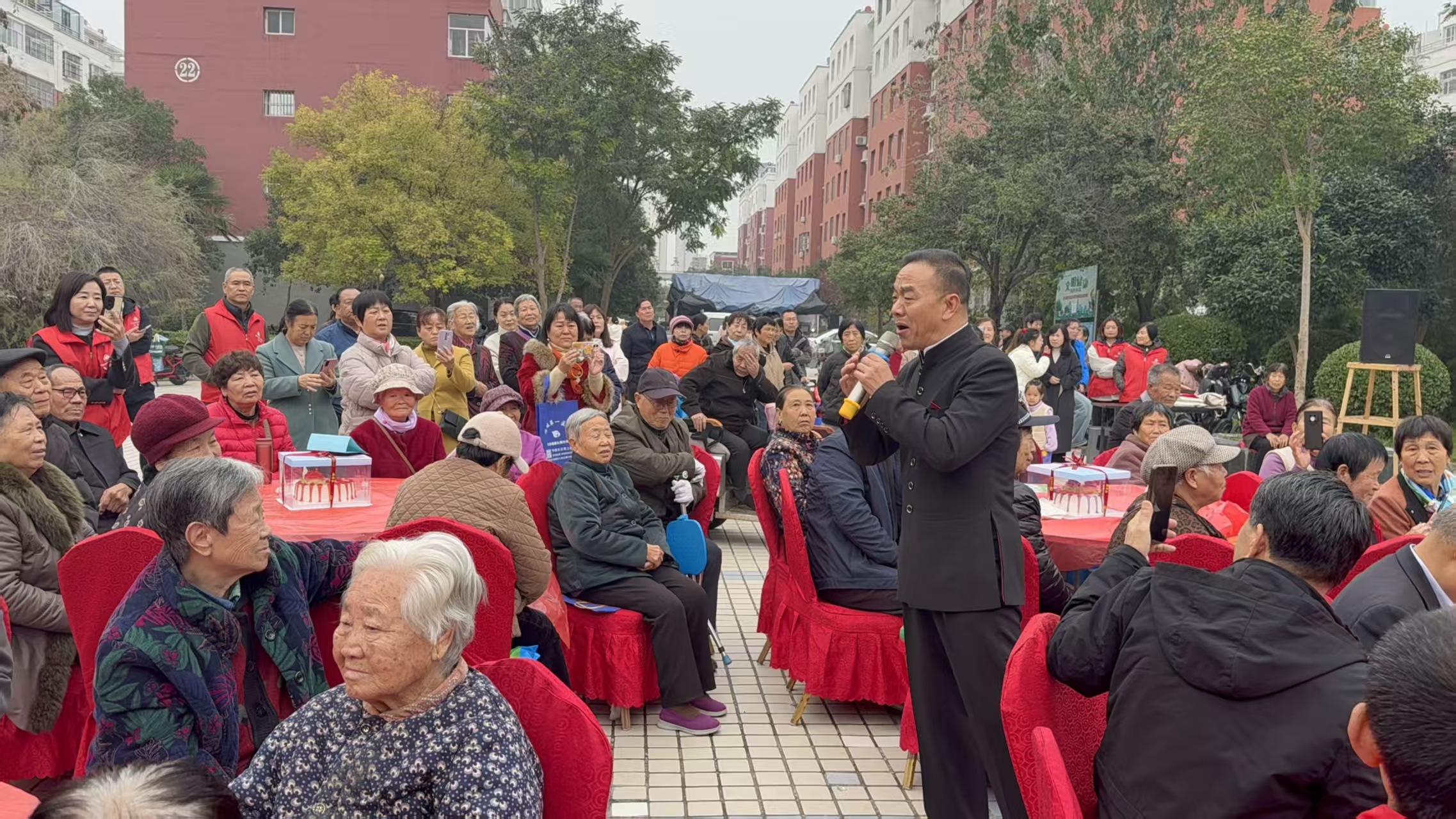 活动现场,暖意融融。爱心义诊区,医护人员为老人测血压、查血糖,细致解答健康疑问,贴心叮嘱日常护理要点,用专业守护老人健康;文艺汇演环节,歌舞、戏曲等节目先后上演,老人们看得津津有味,不时拍手叫好,欢声笑语不断;香甜的奶油蛋糕整齐摆放,热气腾腾的羊肉泡馍香气扑鼻,老人们围坐在一起,畅谈生活趣事,幸福感溢于言表。工作人员还为老人们系上鲜艳的红围巾,红色的围巾为即将到来的冬日增添了暖意,更系住了社区对老人的牵挂与关爱。