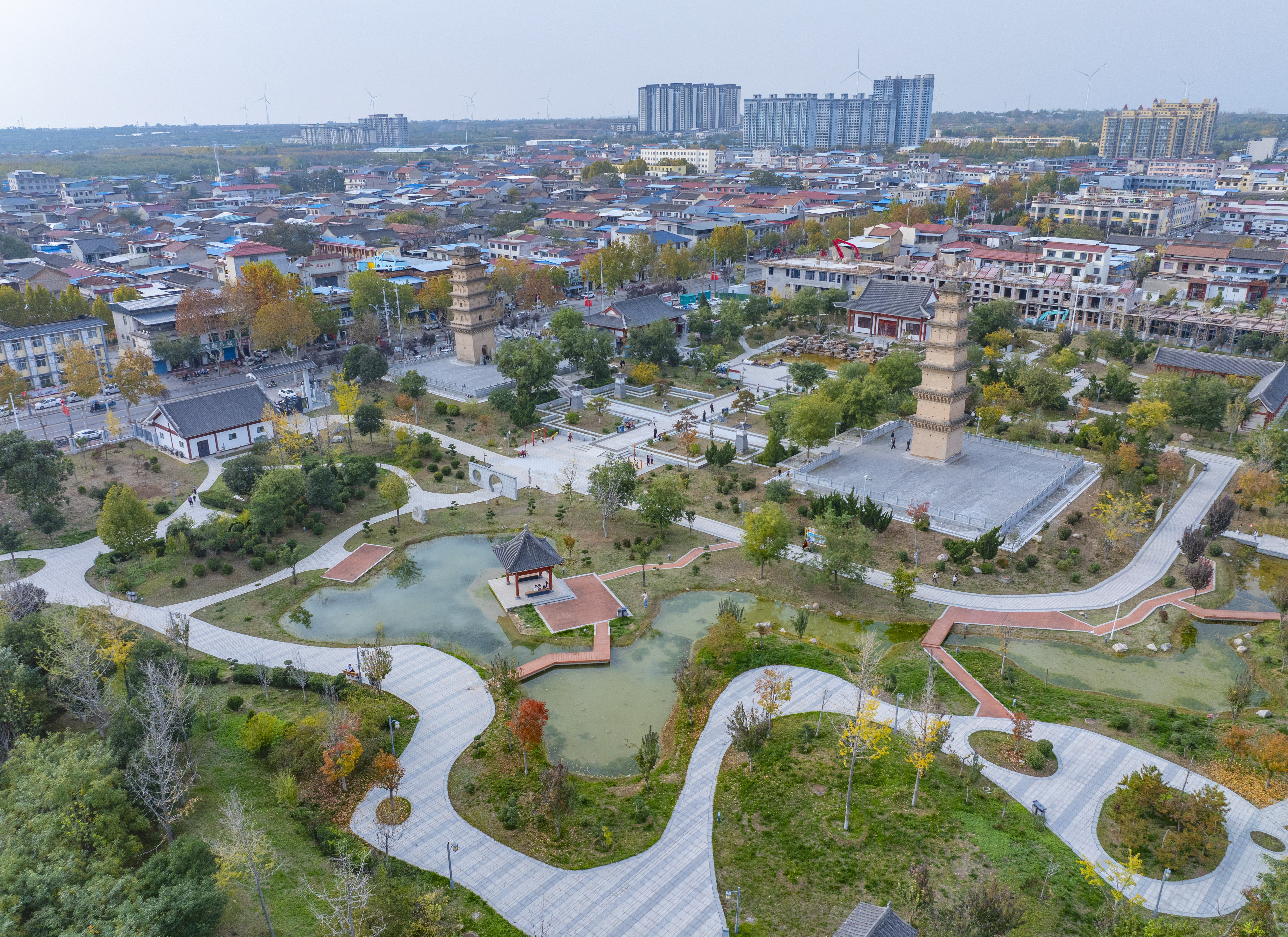 近年来,临猗县在严格保护古塔文物本体的基础上,同步推进周边环境绿化提升与功能完善,实现了文化遗产保护与城市公共服务提升,让古老双塔焕发新生机。图为11月11日拍摄的临猗双塔公园。