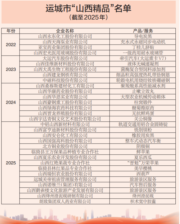 运城晚报讯 近日,省公用品牌建设联合会发布2025年度“山西精品”产品和服务名单,全省共80项成果入围。其中,我市15项产品和服务跻身其中,至此,我市“山西精品”数量已达31个。