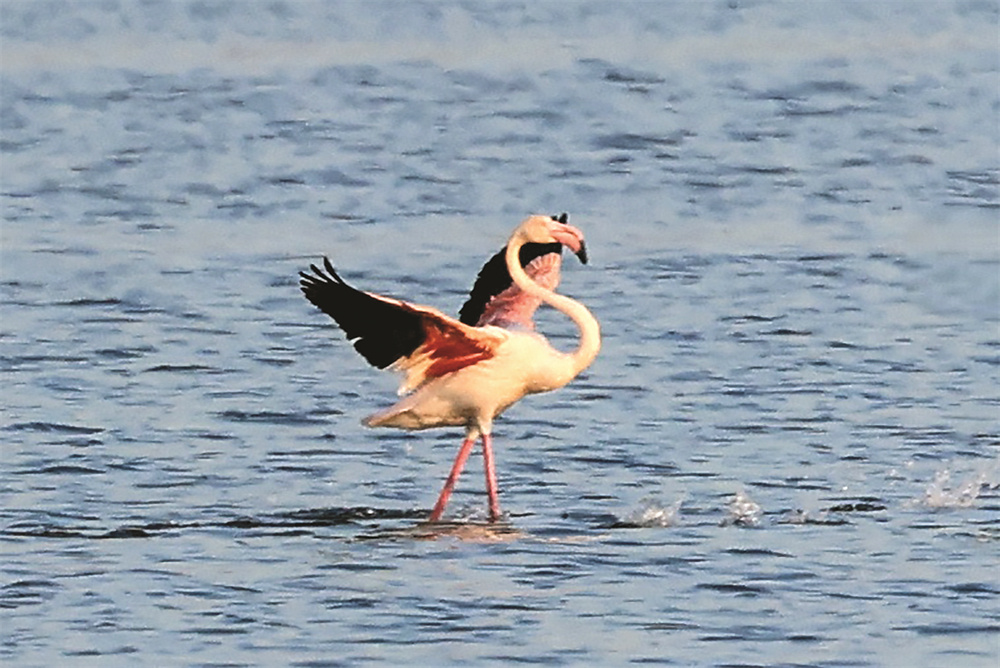 它们身披粉羽、姿态优雅,已成为盐湖湿地一道动人的生态风景。