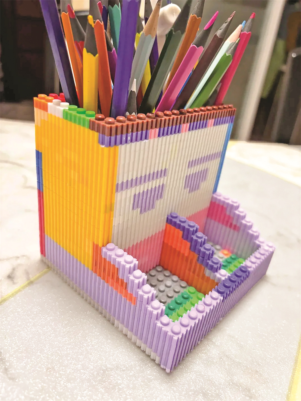 “先按照片尺寸拼了个相框,把孩子的成长照嵌进去,没想到摆在家里特别好看。”王女士说,之后她又利用剩余积木拼出抽纸盒和笔筒,“抽纸盒分盒底、盒身和盒盖,用大颗粒积木做底座更稳固,小颗粒拼盒身还能设计花纹,放在客厅完全看不出是废旧玩具改造的。”如今,王女士家的书桌、电视柜上,随处可见乐高改造的实用物件,“不仅解决了收纳难题,还培养了动手能力,每次朋友来家里做客都要问改造方法。”