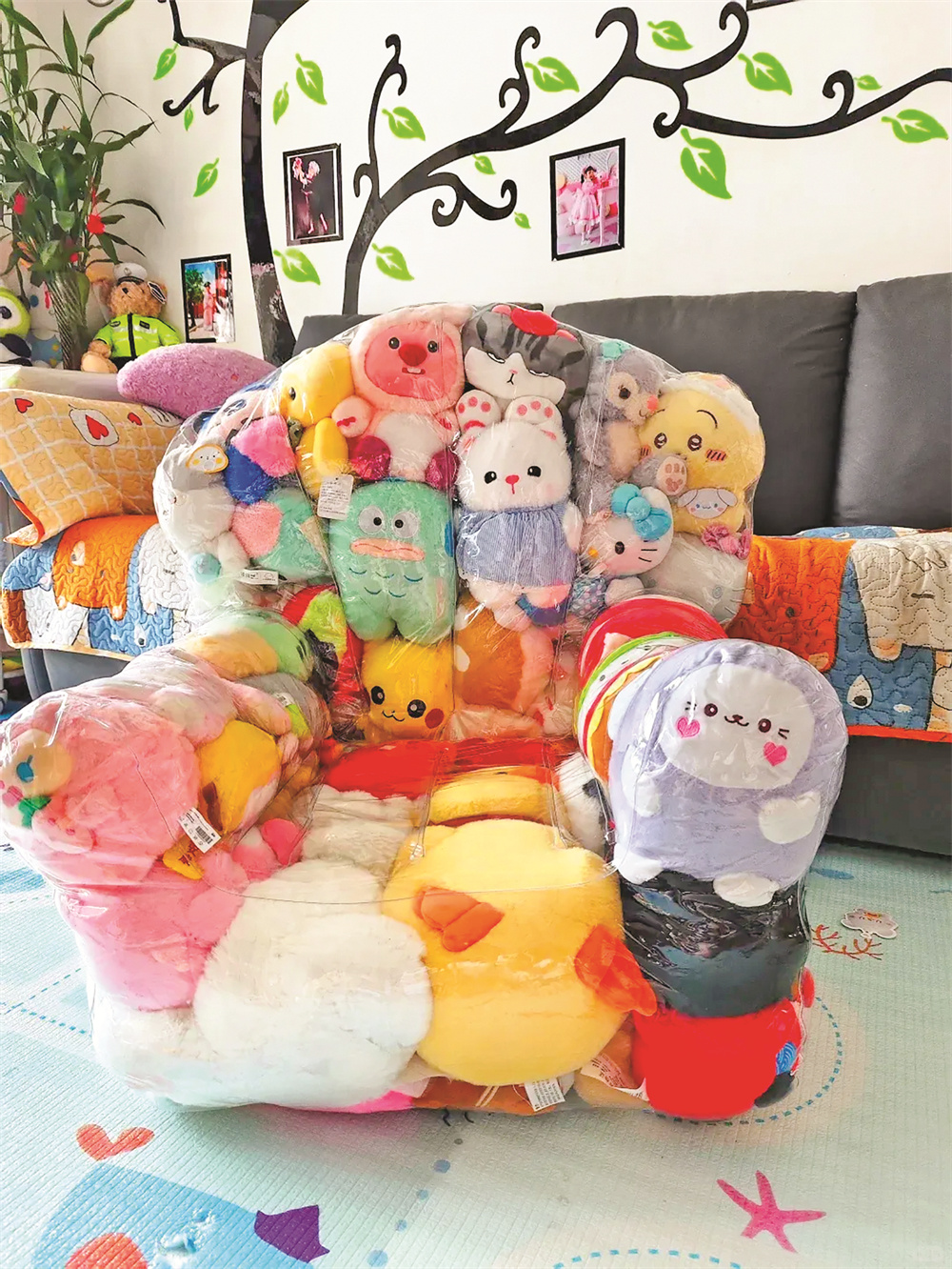 对于家里堆积如山的毛绒玩具,盐湖区东城街道河东东街社区的刘女士也有妙招。“女儿喜欢抓娃娃,家里的毛绒玩具加起来有上百个,堆在沙发上占地方,还容易积灰。”刘女士说,她在网上买了透明沙发套,将闲置的毛绒玩具全部塞进去,做成了一个柔软舒适的小沙发,“女儿平时可以坐在上面看书、玩游戏,既环保又实用,还解决了毛绒玩具的收纳问题。”刘女士还分享,毛绒玩具改造的沙发不仅颜值高,而且透气性好,“定期把沙发套拆开清洗,还能避免细菌滋生,比买的沙发更有趣。”
