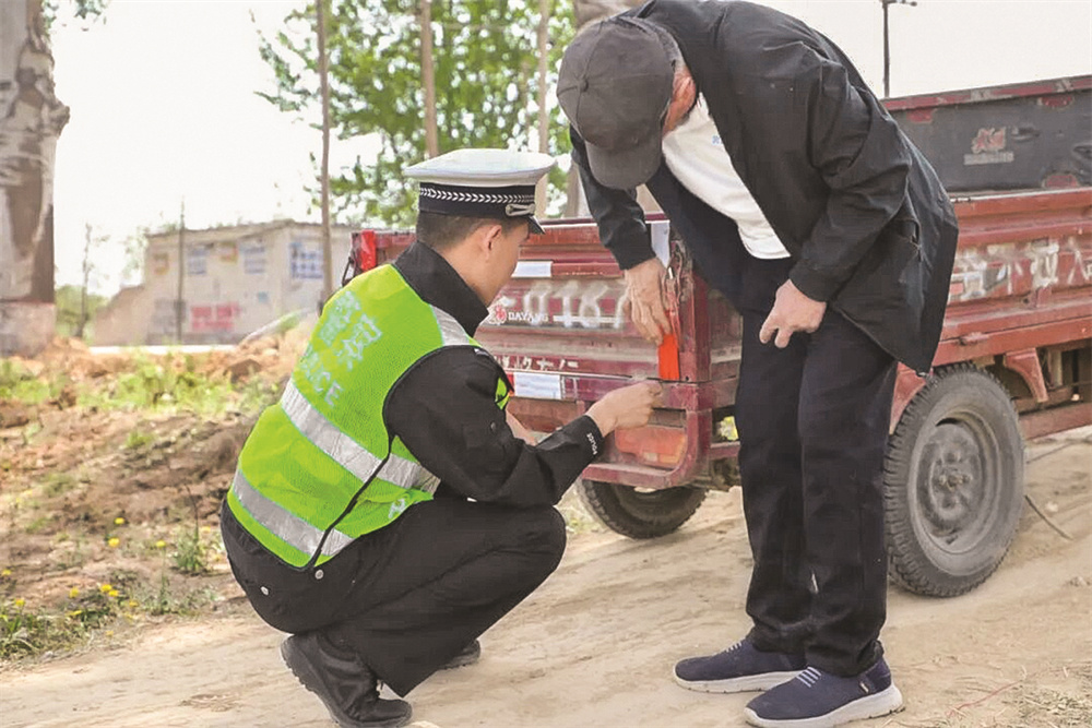 在临猗县孙吉镇的村道上,临猗县公安局交管大队民辅警正弯腰为一辆三轮车张贴反光条,车尾新喷的编码在阳光下格外醒目。