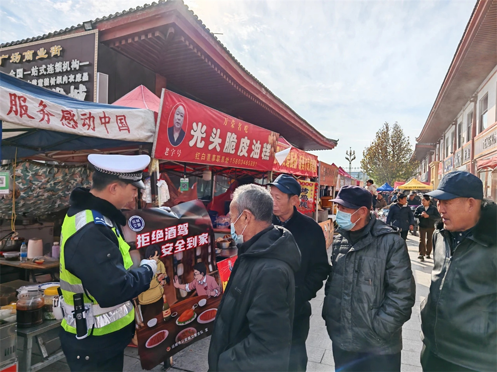 芮城县公安局交通管理大队组织民辅警借城隍庙物资交流会积极开展交通安全宣传。