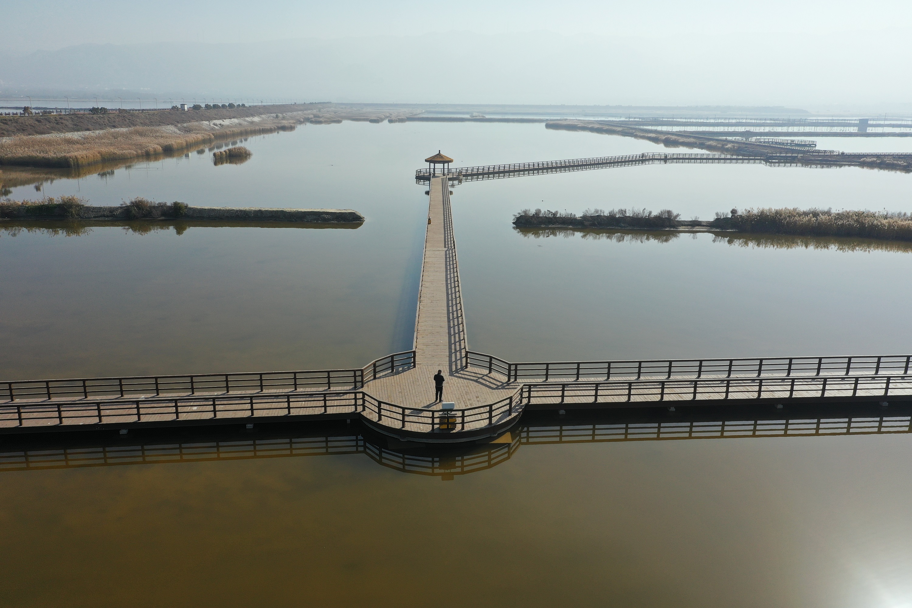 近日,航拍镜头下的运城盐湖冬日风光。木栈道宛如银色丝带,蜿蜒穿梭于碧波之上,串联起湿地、芦苇荡等自然景观,让冬日盐湖呈现出别样景致。 特约摄影 郝健
