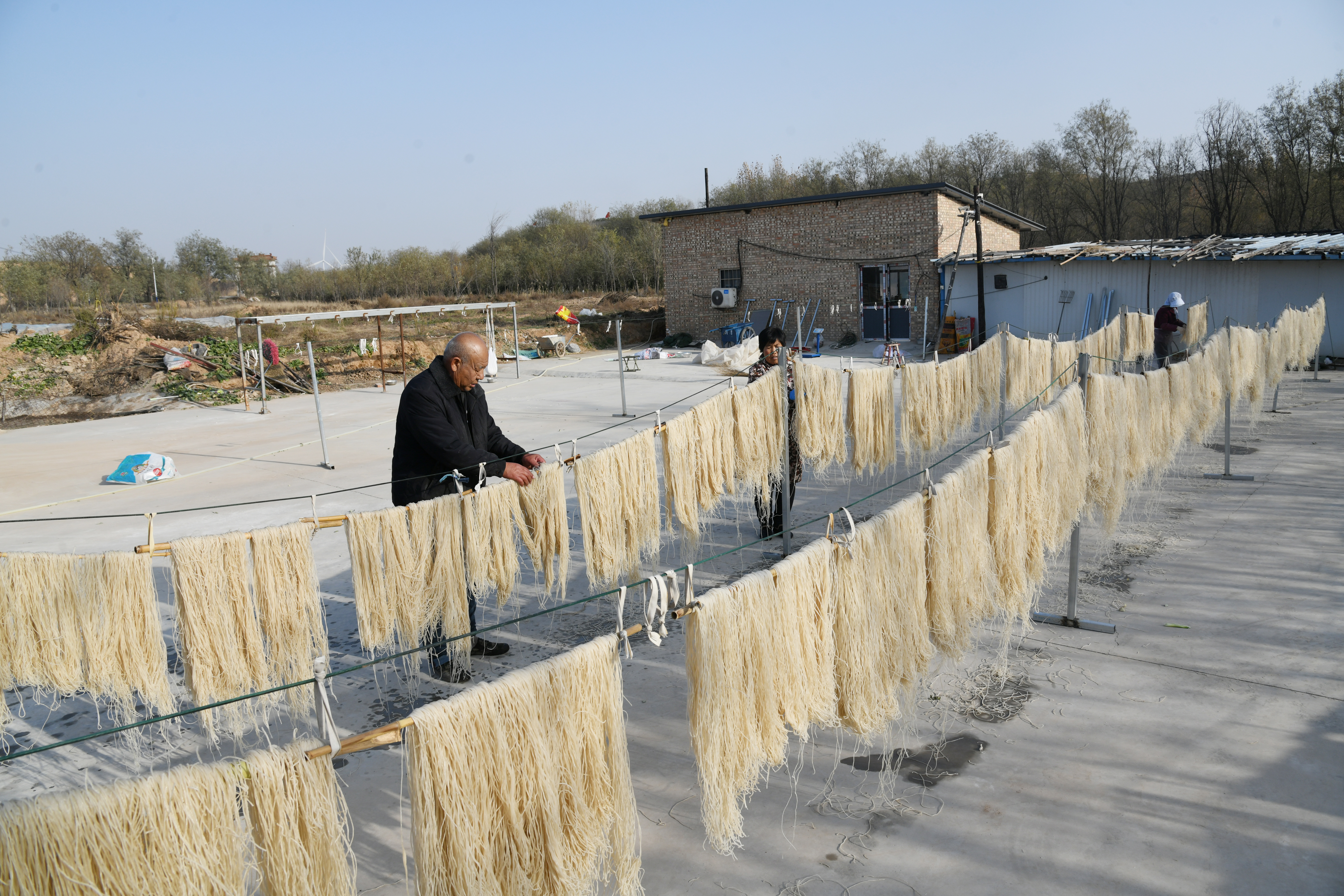 12月2日,闻喜县桐城镇东吴村村民在晾晒红薯粉条。冬日里,一杆杆、一片片晾晒的红薯粉条,成为别样的乡村风景。