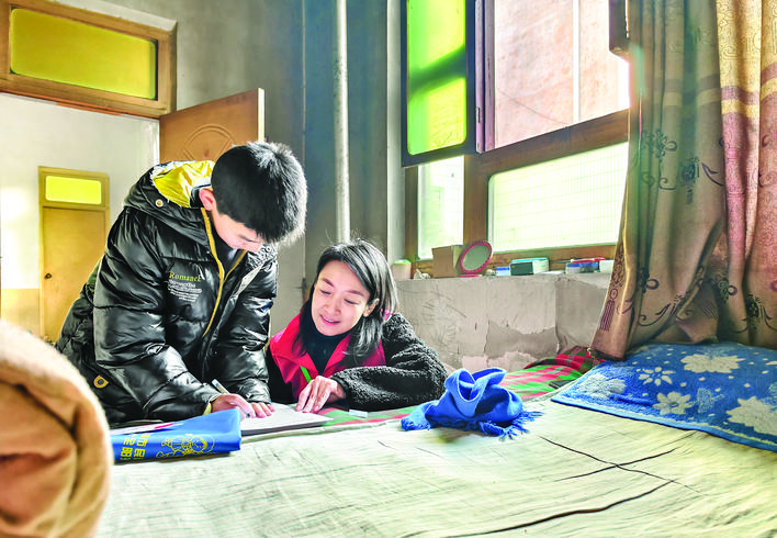 临猗县志愿者辅导困境儿童写作业。(资料图片)