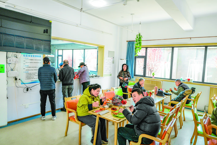 在叠翠社区食堂,志愿者招呼居民就餐。