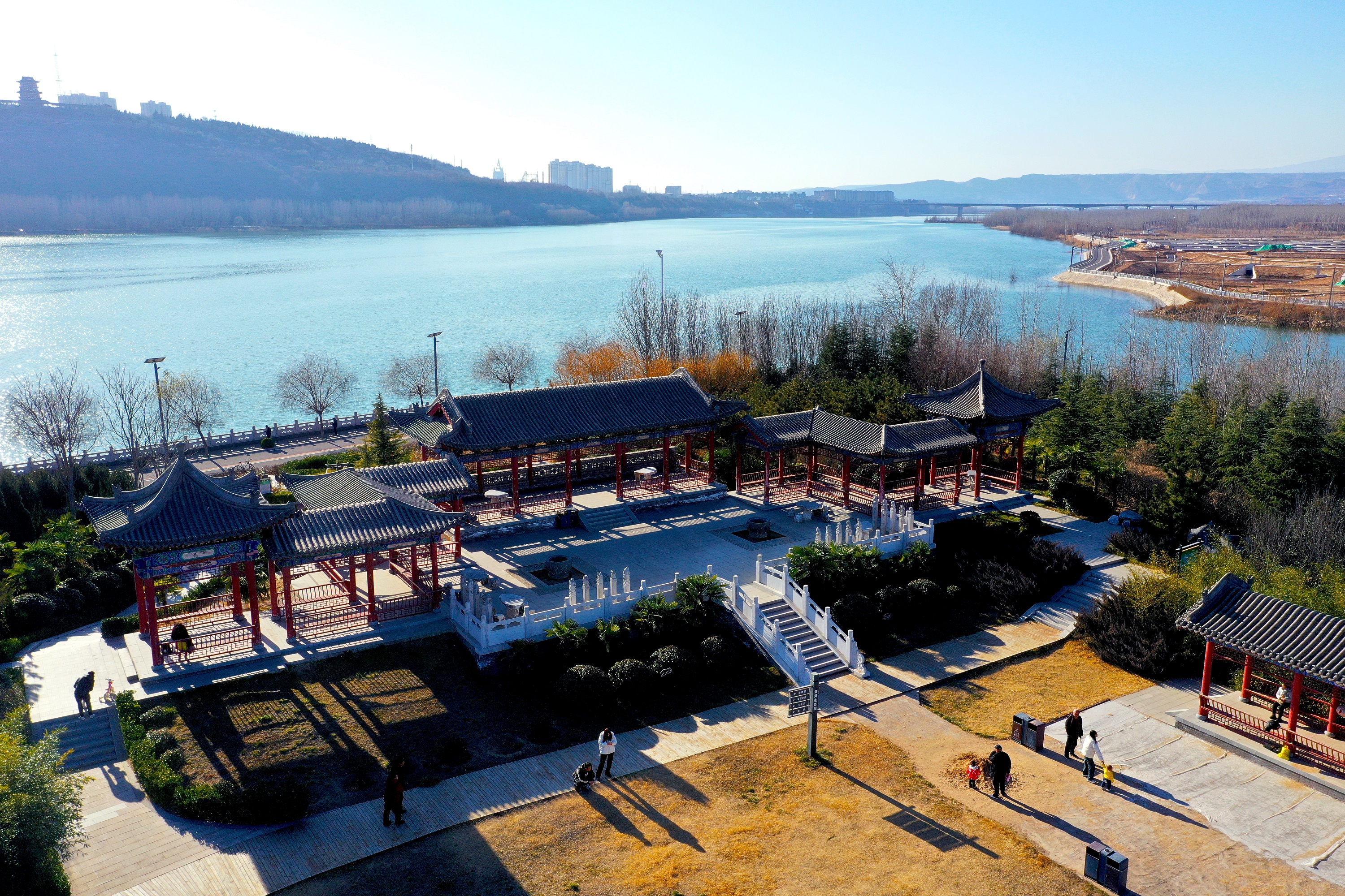 12月25日,游客在平陆县黄河生态园漫步,欣赏黄河岸畔的冬日美景。