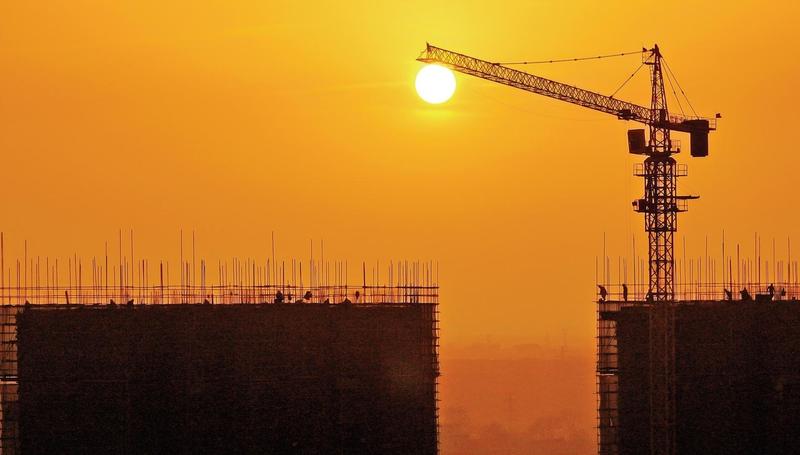 12月23日,夕阳和晚霞中,施工人员在新绛县强绛富民重点工程现场加紧施工。