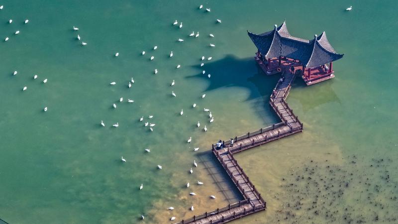 芮城县圣天湖景区:千余只越冬大天鹅在湖面游弋觅食